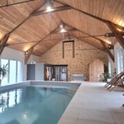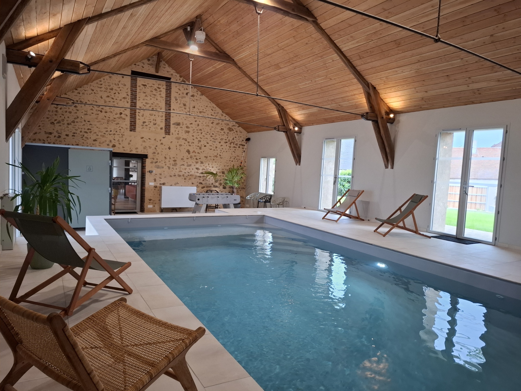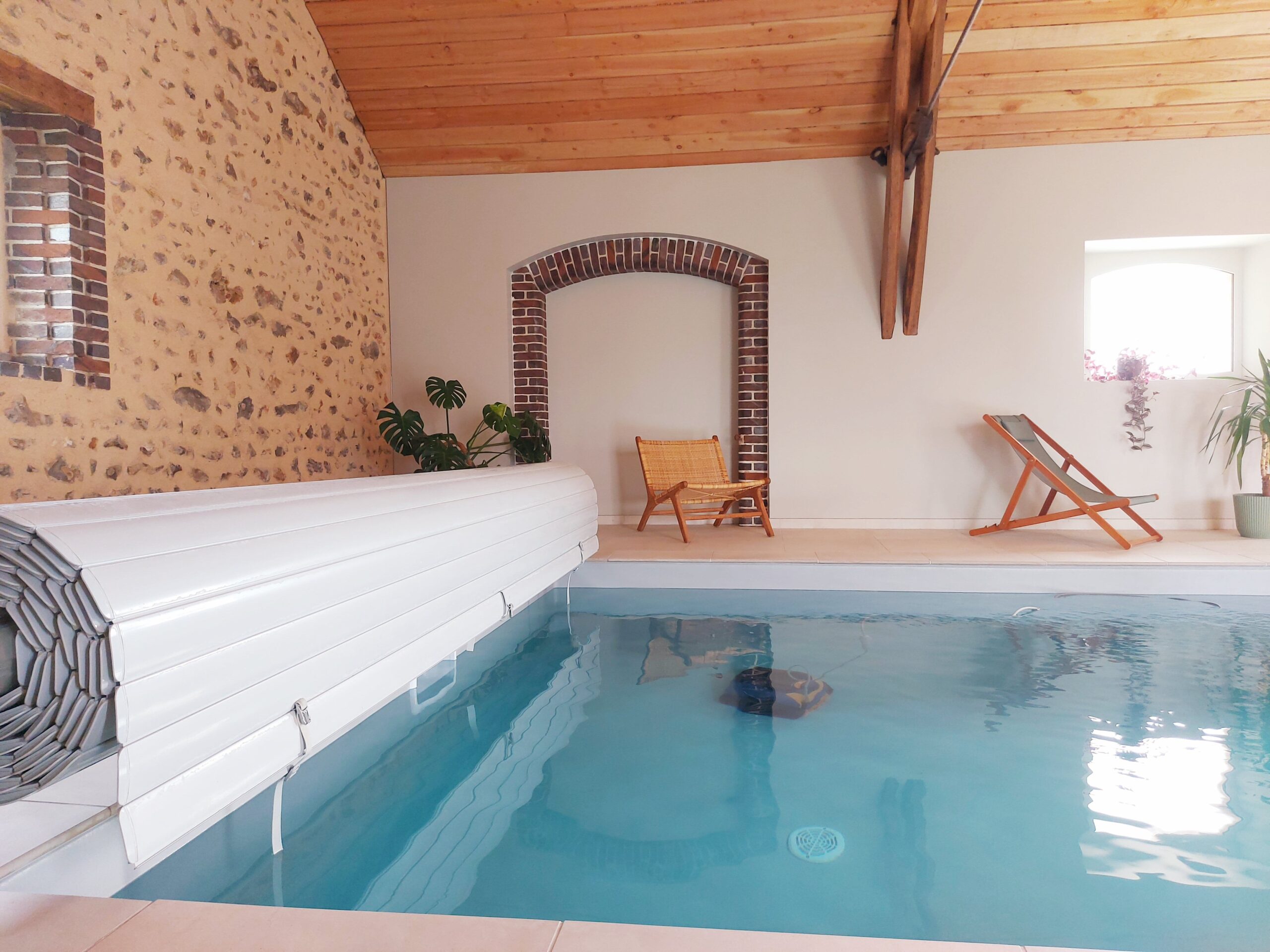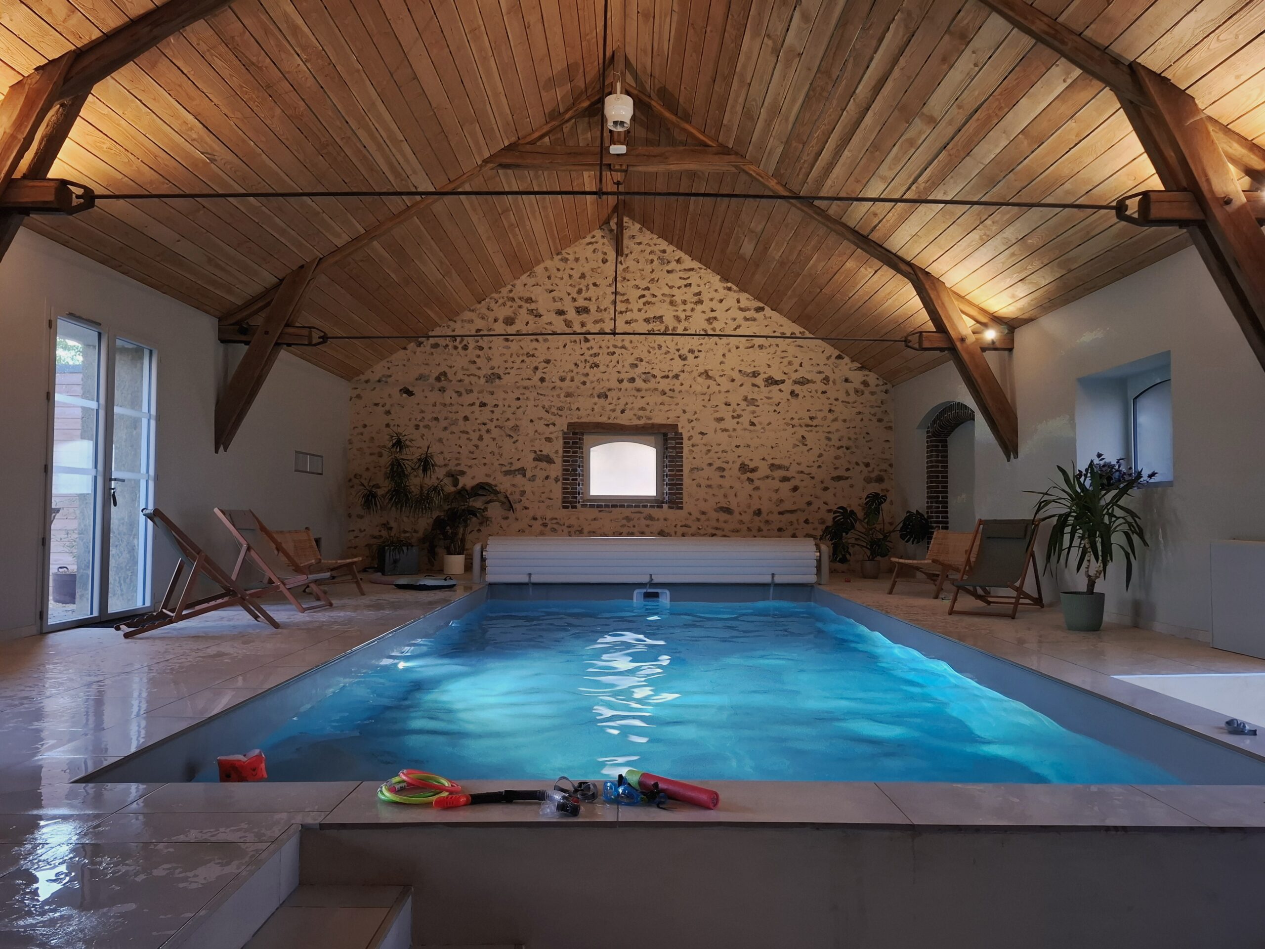 La piscine intérieure, chauffée toute l’année et attenante à l’espace de vie, devient rapidement le lieu préféré des petits comme des grands — parfait pour se détendre, jouer ou simplement profiter du moment.