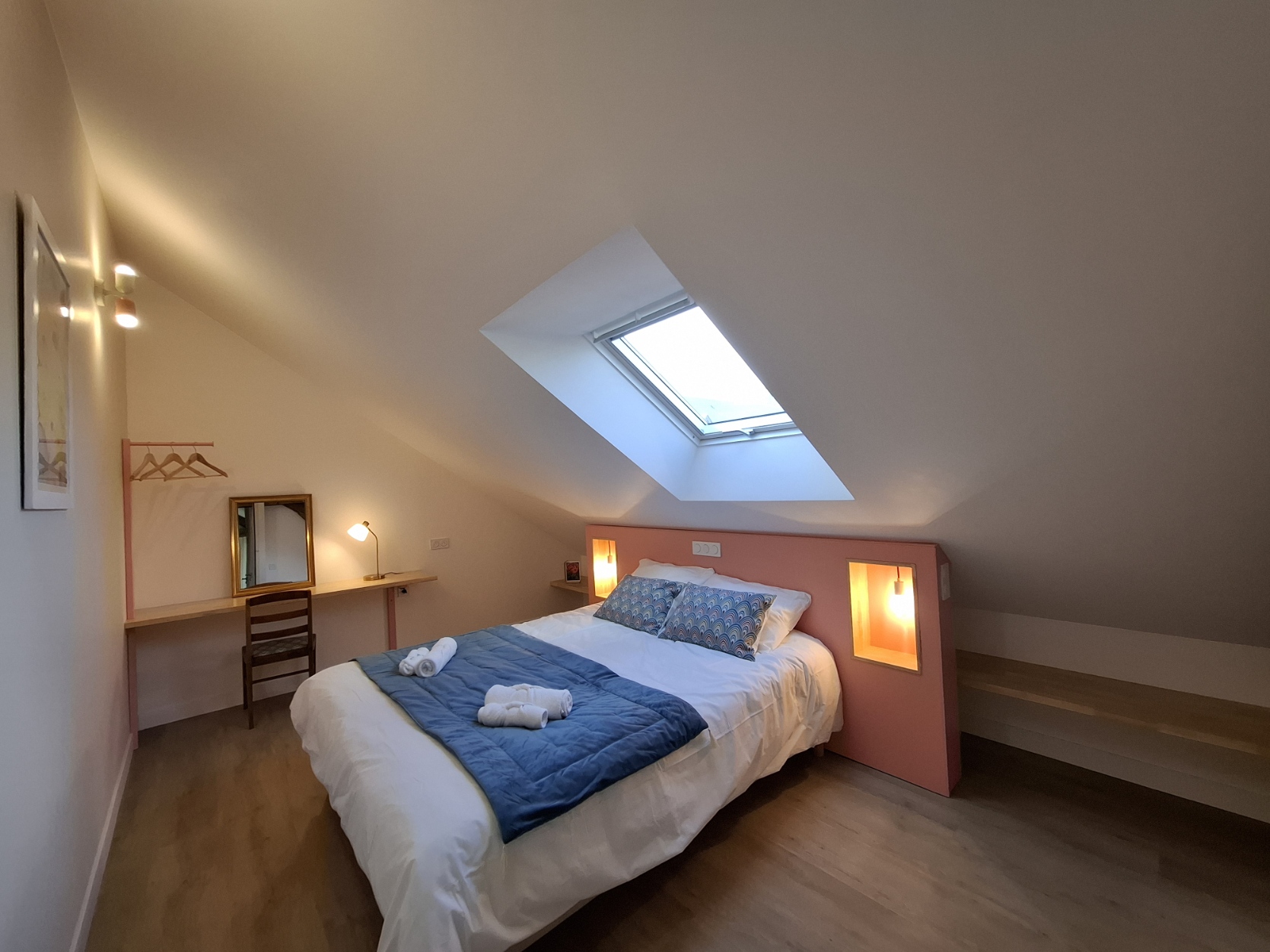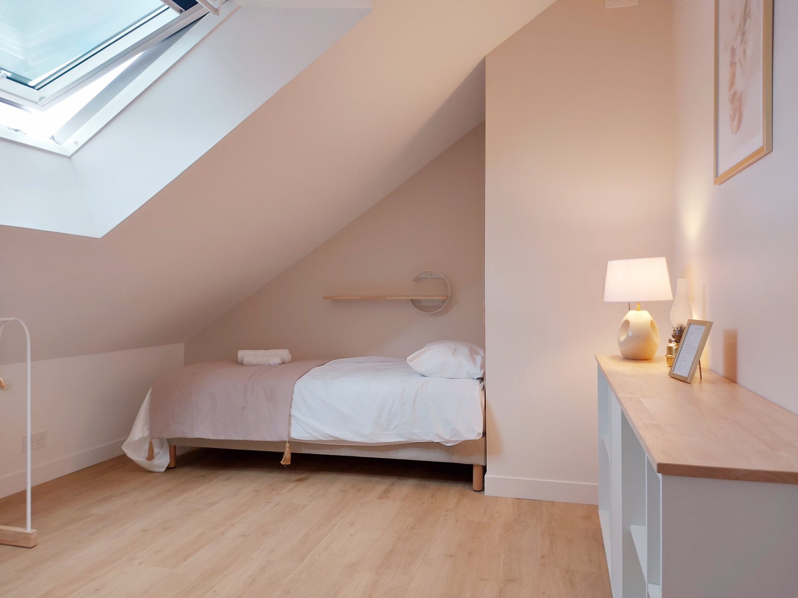 Il dispose d’un mobilier sur-mesure de qualité, d’un espace vestiaire pratique, et offre une vue agréable sur la terrasse et le jardin.