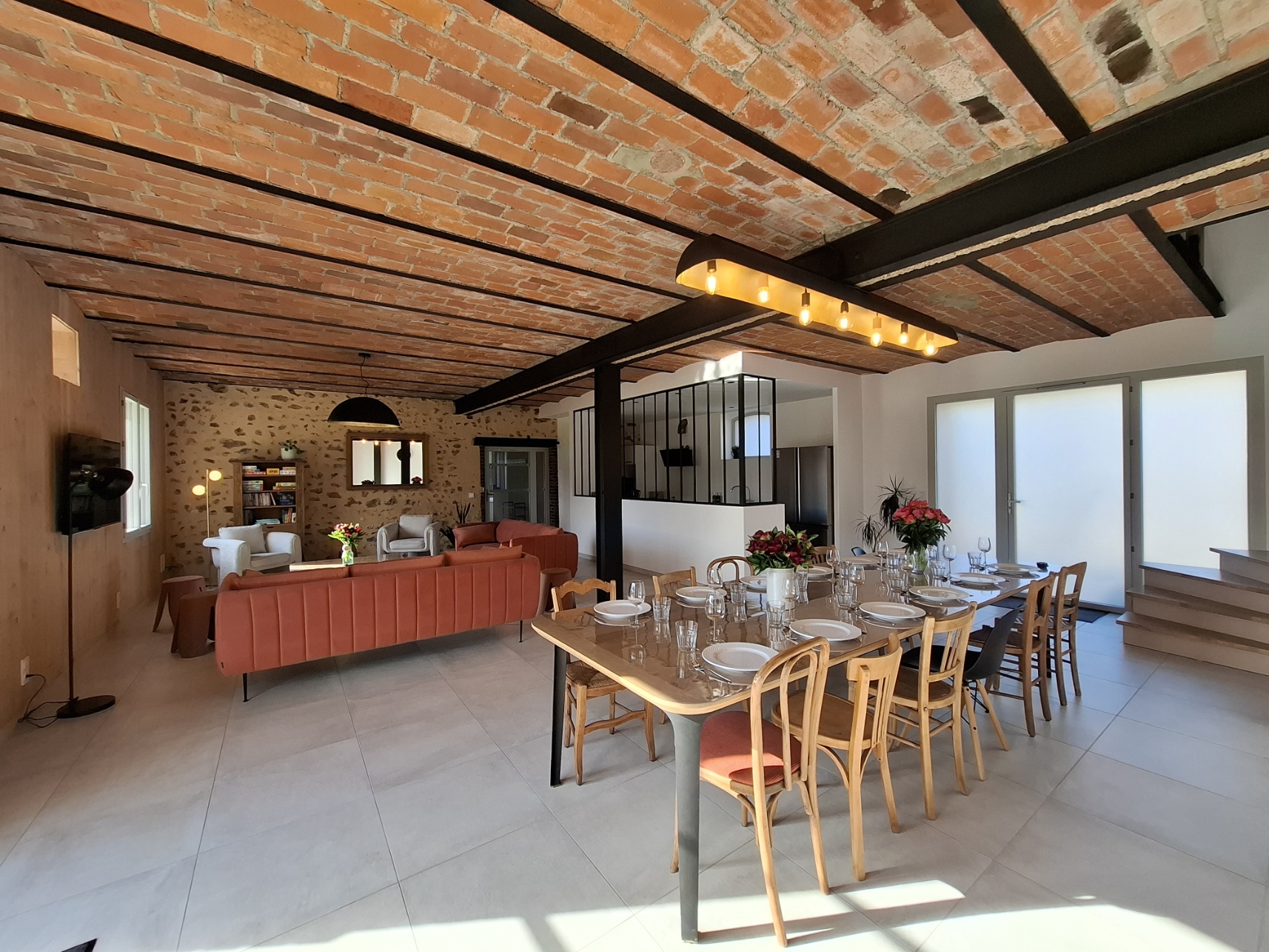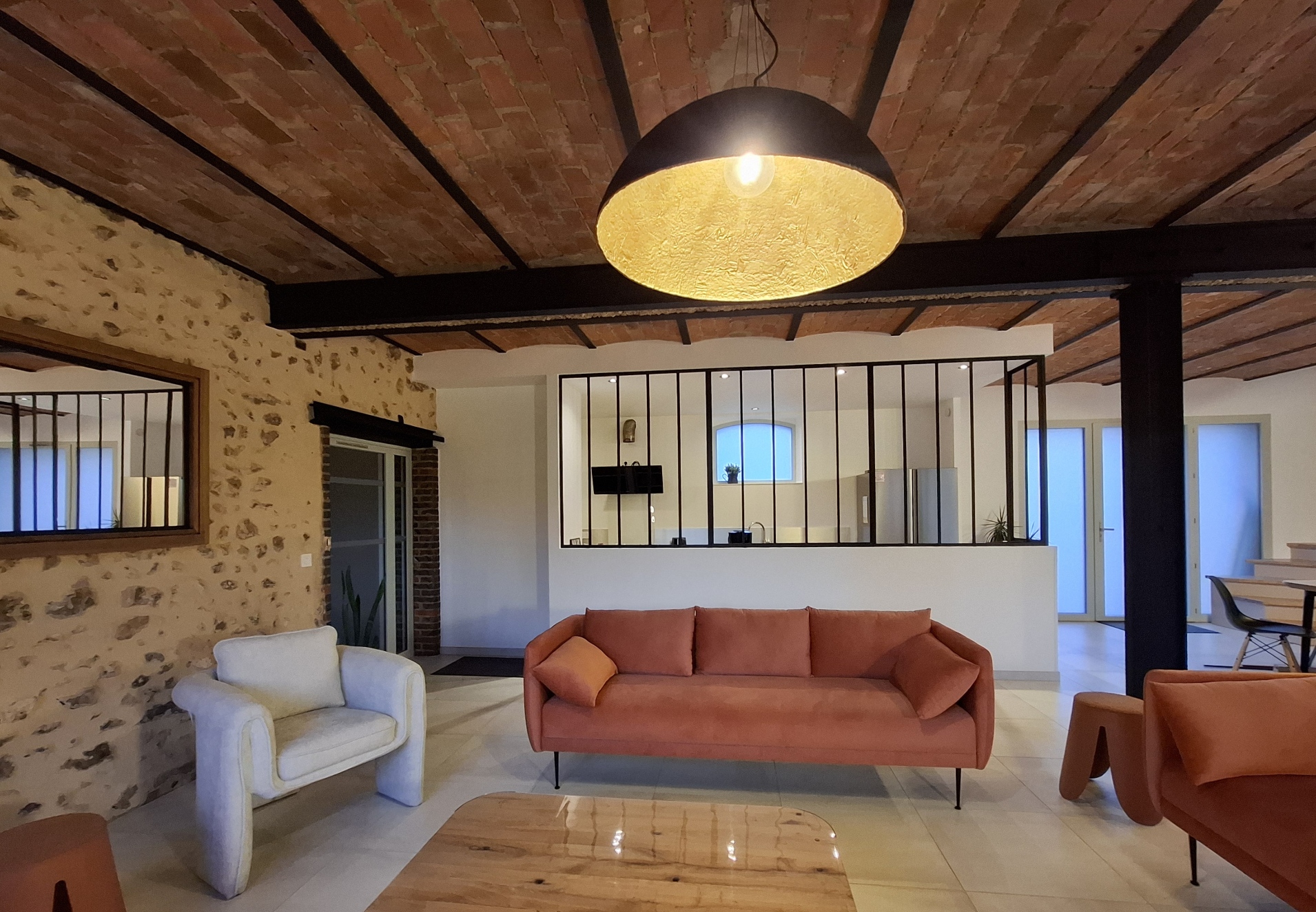 La cuisine se dévoile derrière une verrière ouverte, comme une pièce à vivre à part entière.