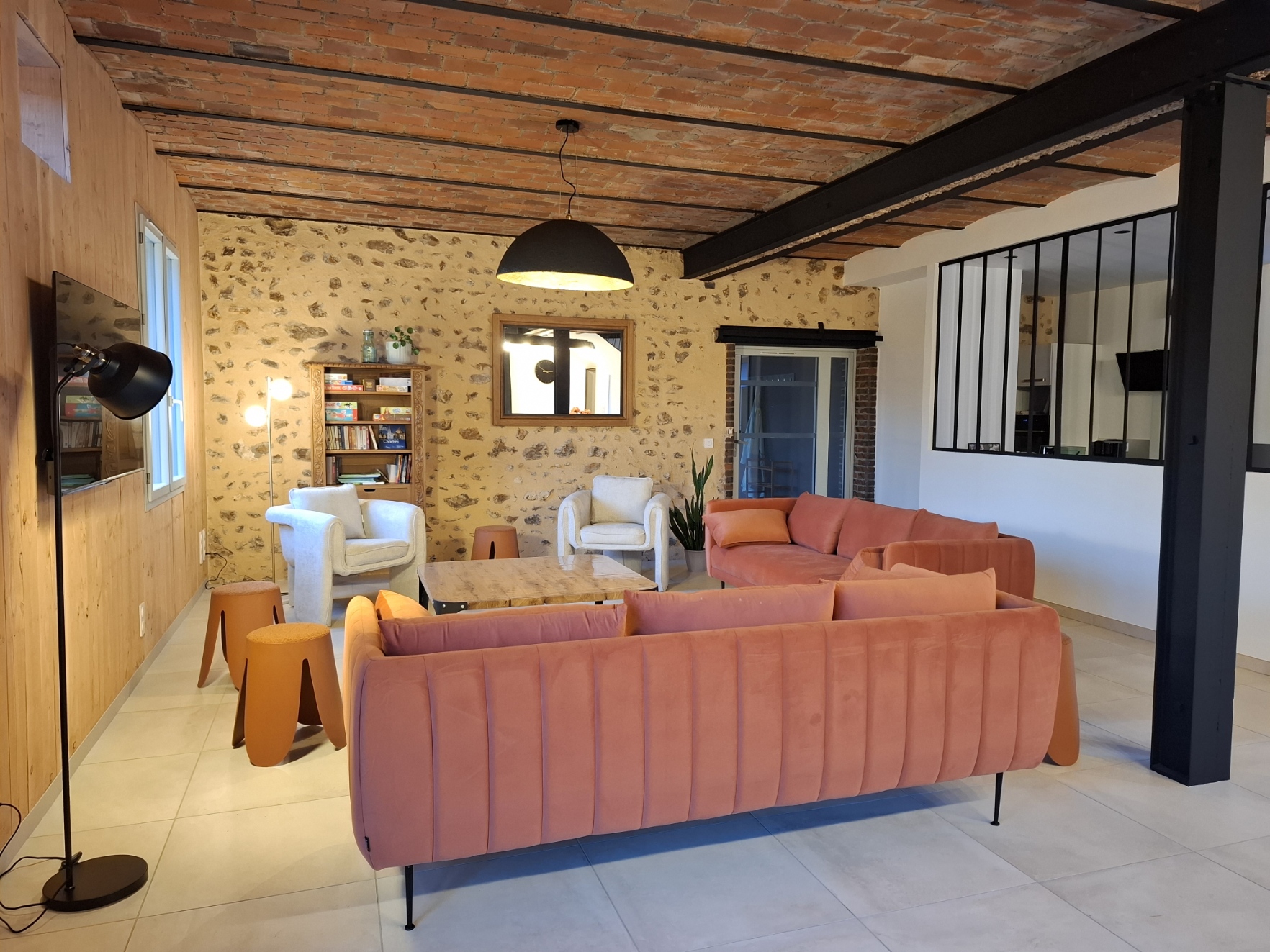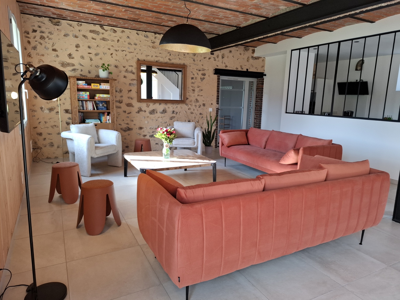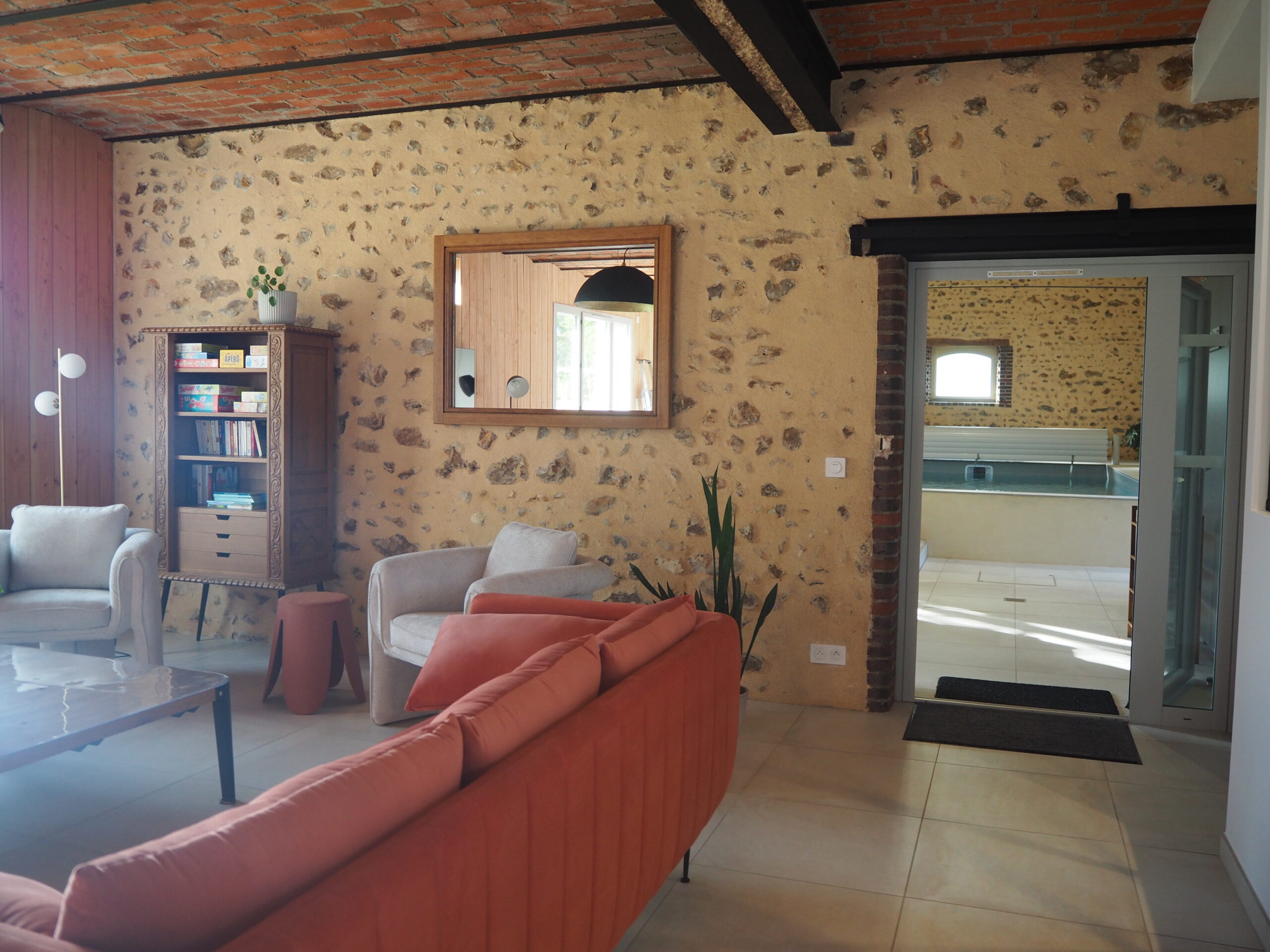 La disposition ouverte permet un accès direct à l’espace détente (piscine intérieure et baby-foot), offrant une continuité agréable et fluide entre les différentes zones de vie et créant une atmosphère accueillante et relaxante pour tous.