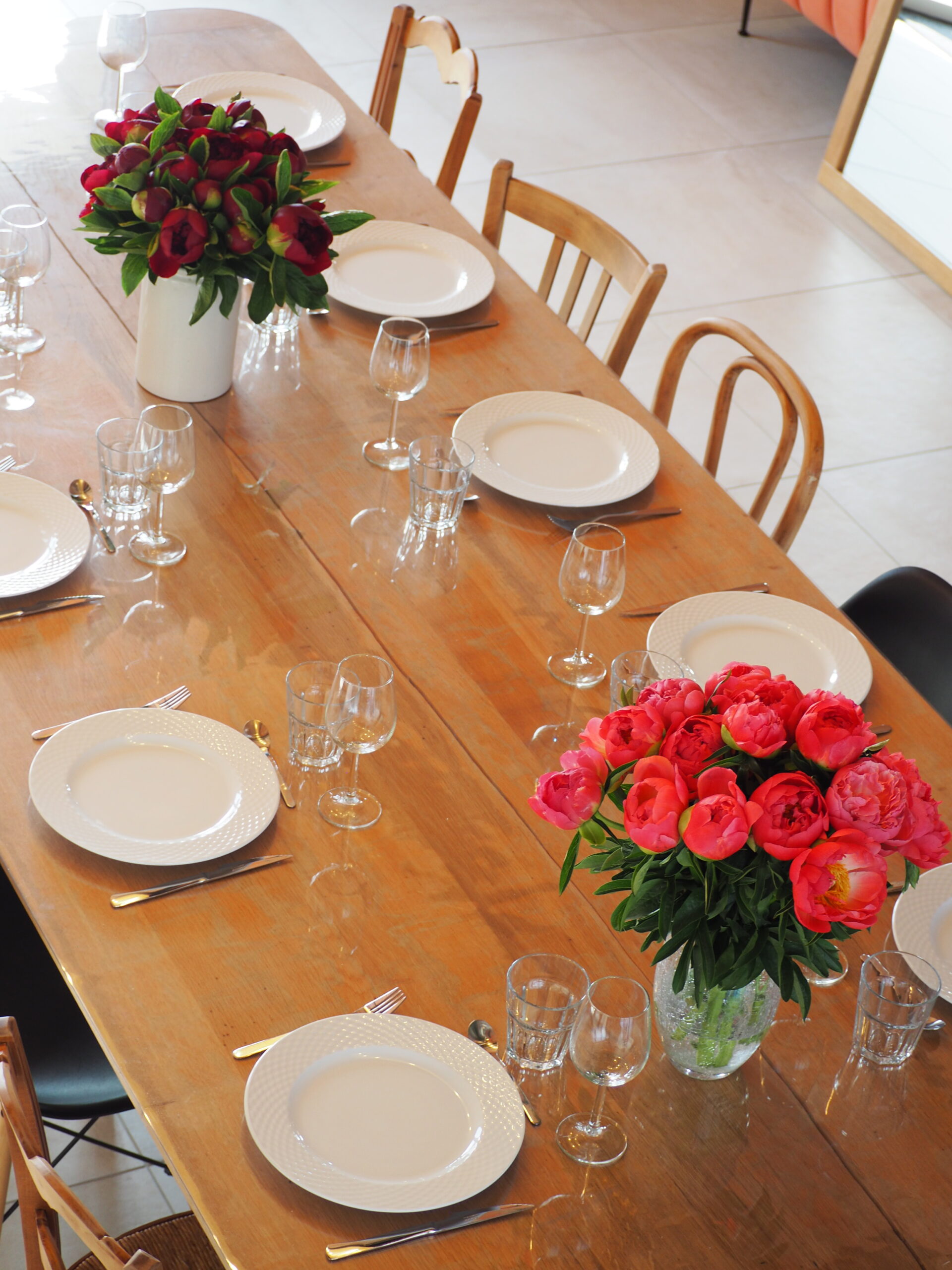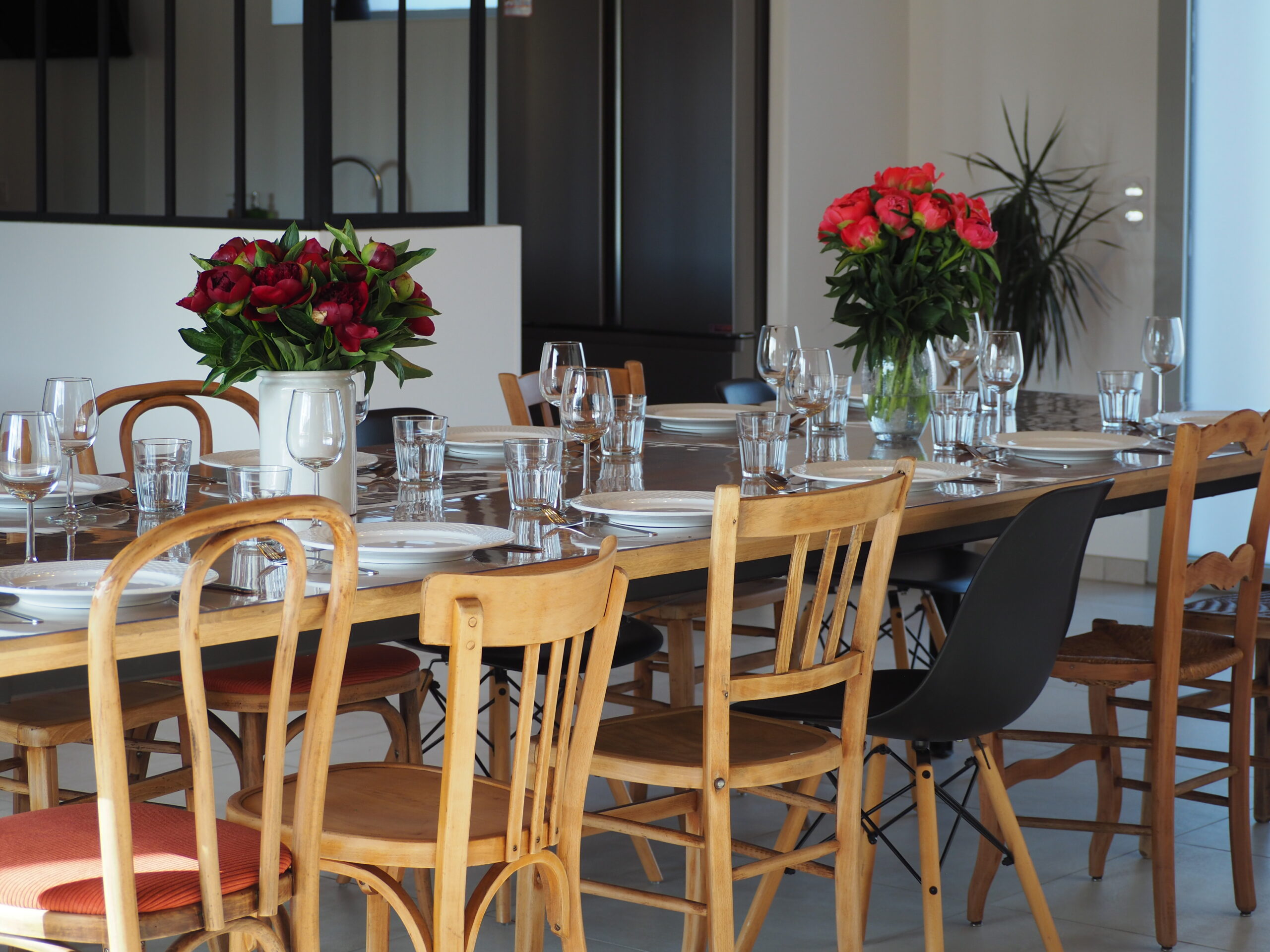 Vaisselle en nombre (verres à eau, vin, cocktail, flûtes, nombreux plats de service et four, saladiers, moules…)