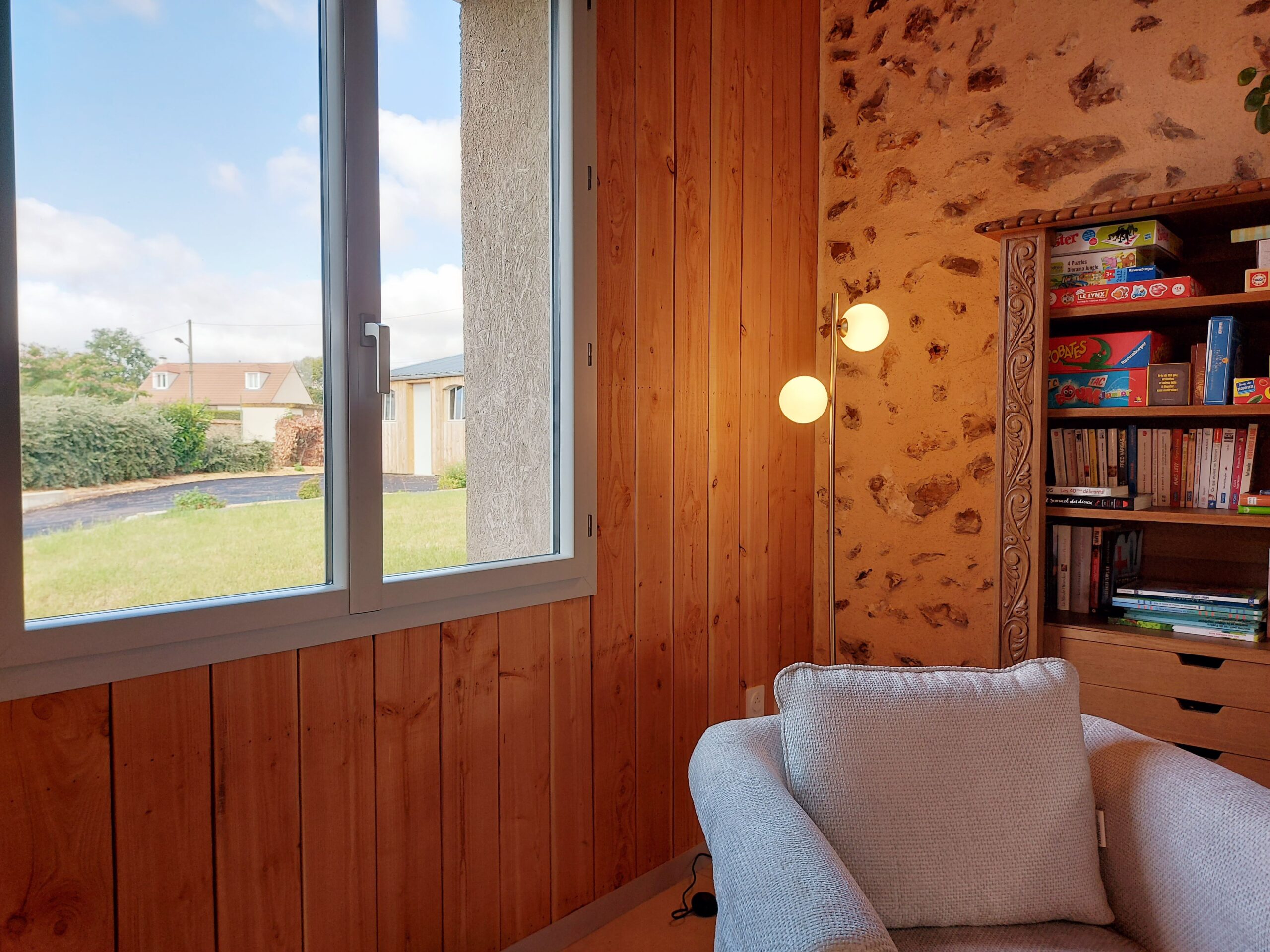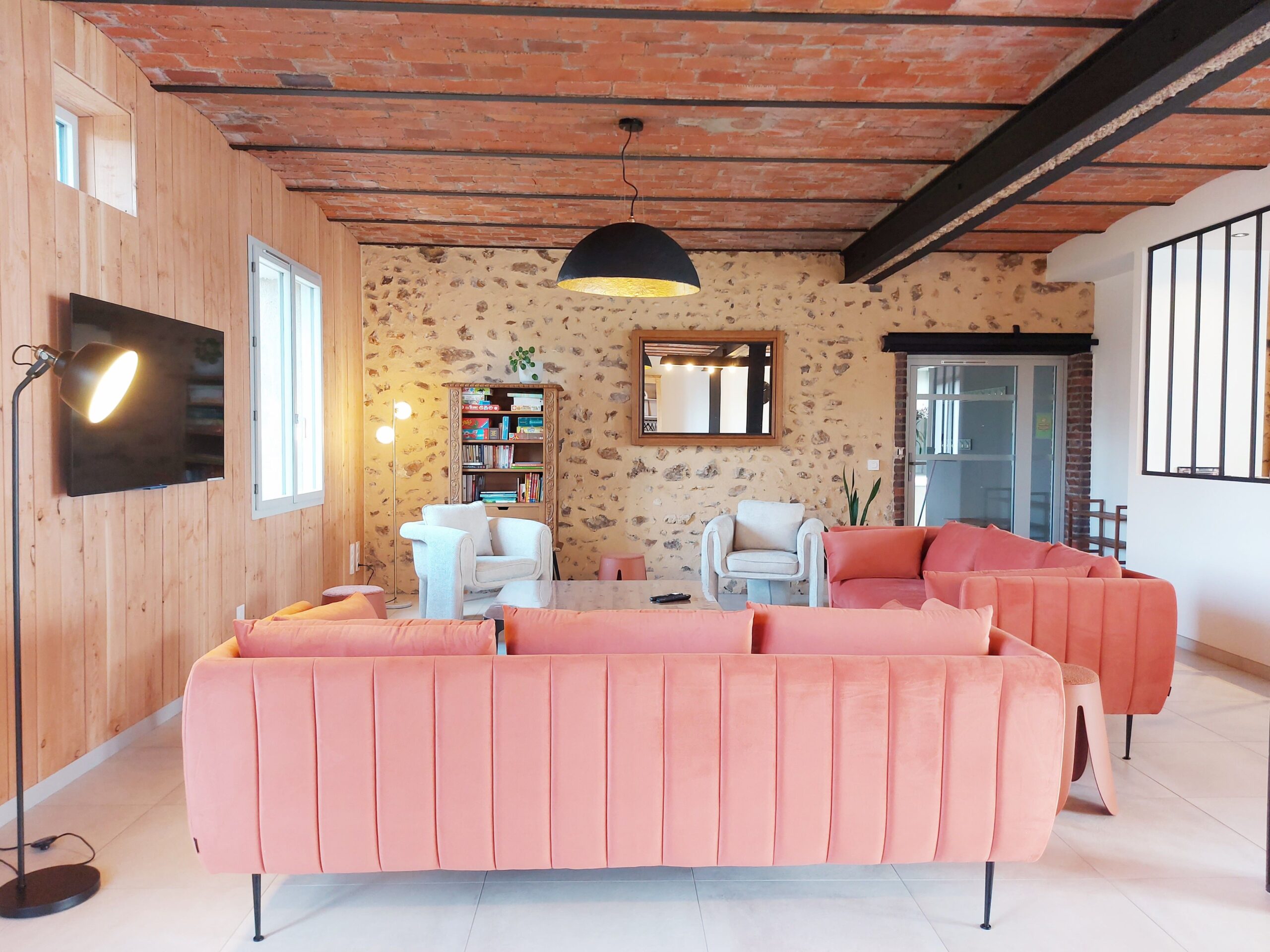 Le salon est un espace à la fois convivial et chaleureux, pensé pour accueillir tous les voyageurs. Canapés et fauteuils confortables invitent à la détente, tandis qu’un meuble dédié propose une sélection de jeux de société et de livres pour enfants et adultes, favorisant des moments ludiques et partagés.